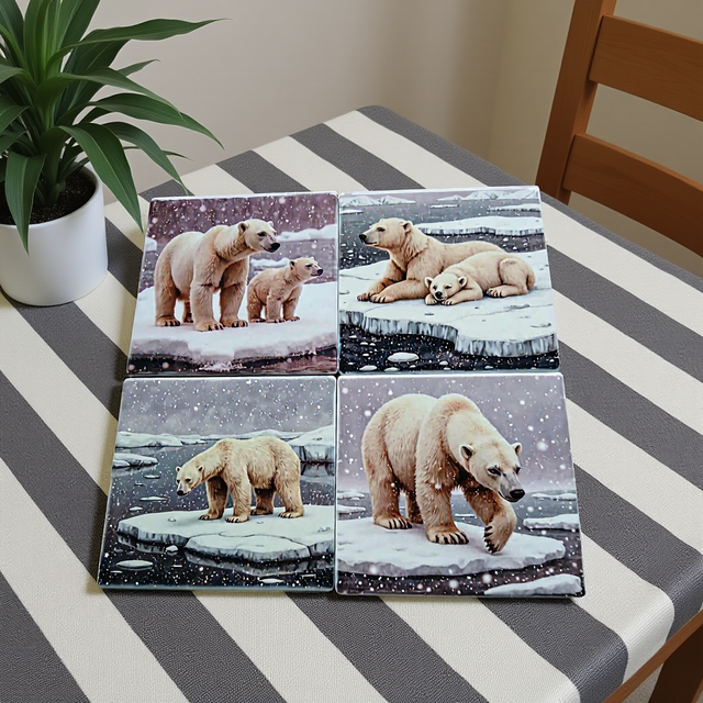 A set of four coasters featuring a bottle of wine and cheese set on a table