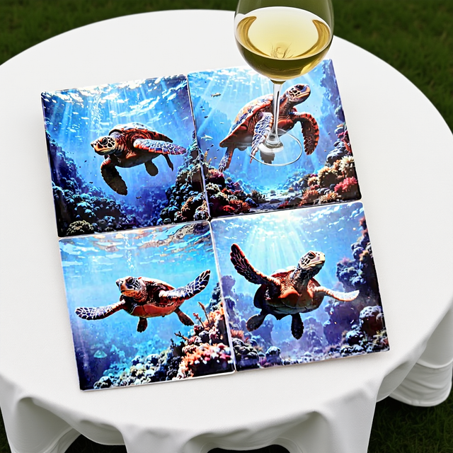 This vibrant 4-piece coaster set plunges you into a sunlit reef where sea turtles glide through coral gardens like slow-motion dancers. Each tile tells a different moment in the drift—flippers mid-stroke, shells catching the light, fish darting through the background like punctuation marks in a silent story.